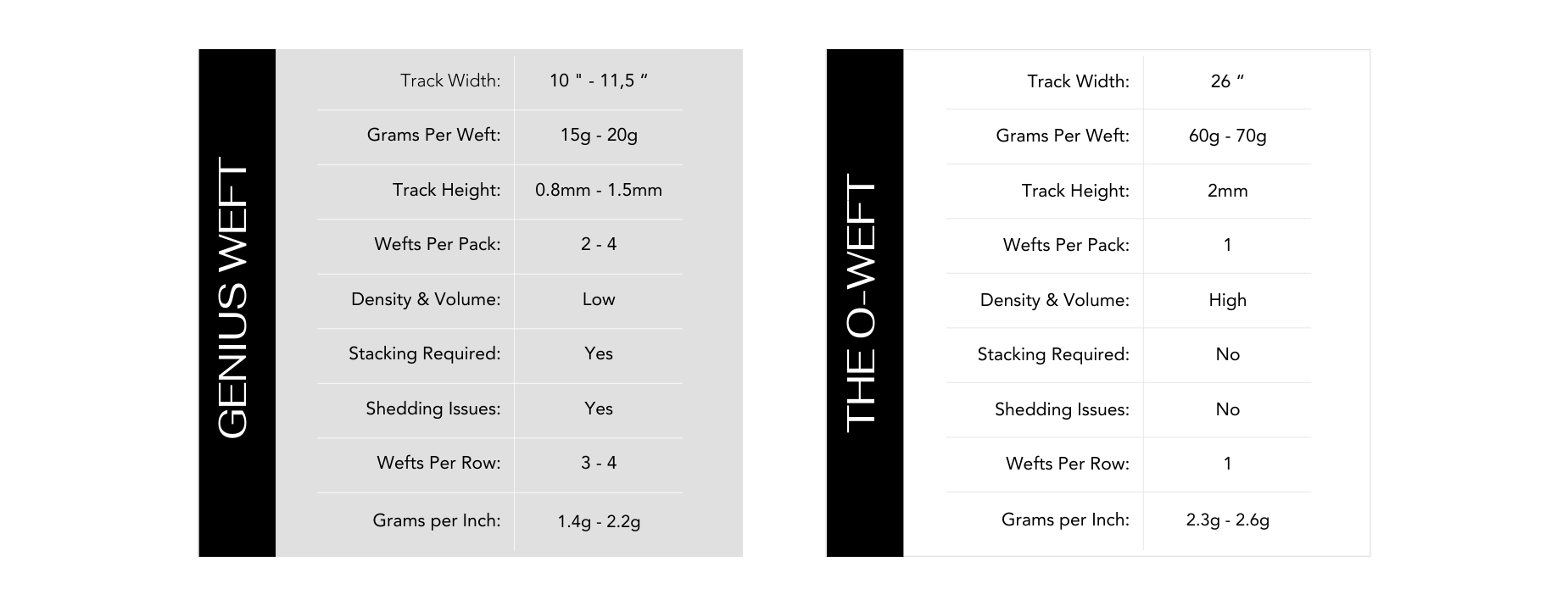 The O-Weft offers double the denisty with more grams per inch than standard genius wefts with our double stiched and reinforced weft.